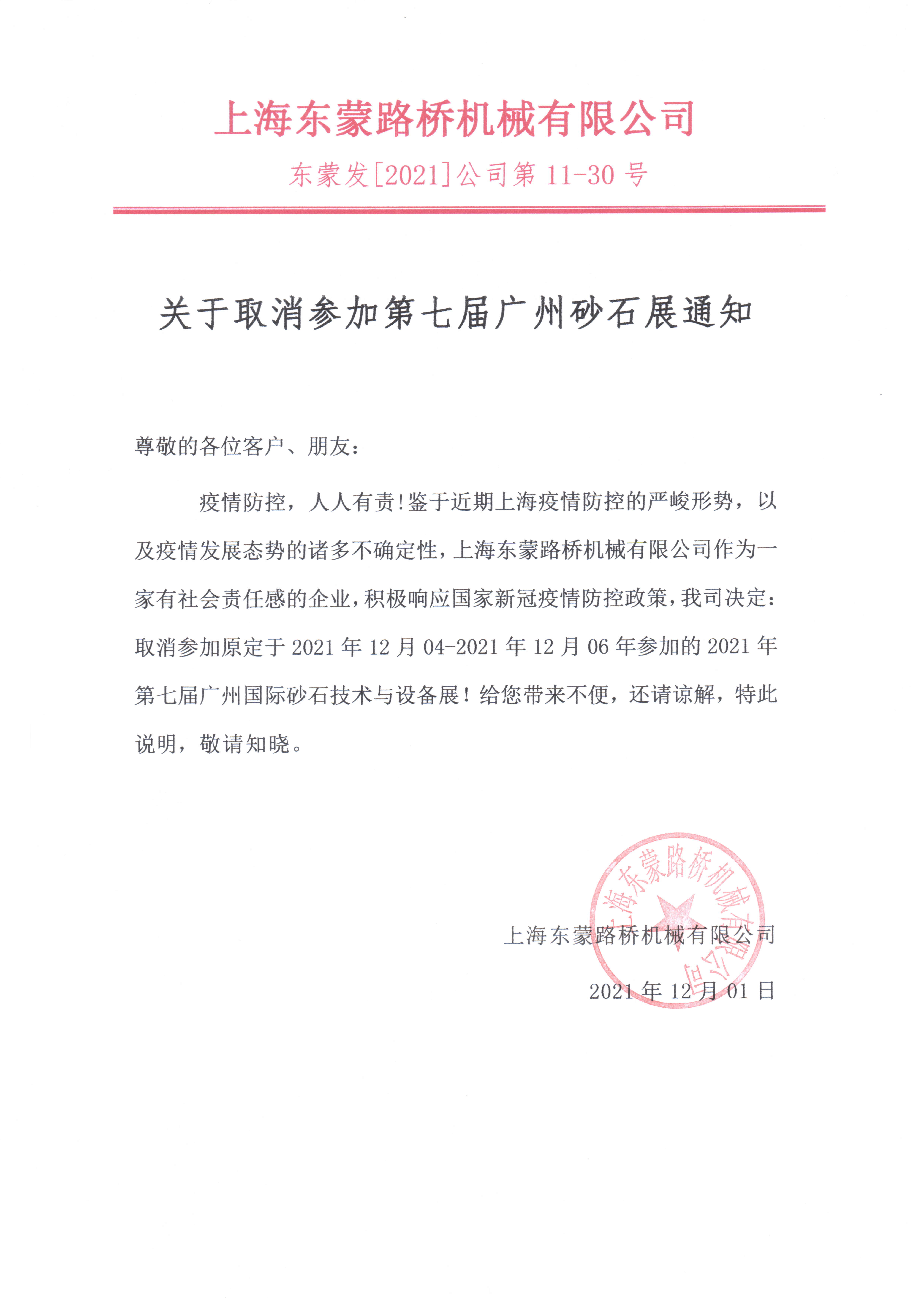 由于近期新型冠狀病毒的影響,結(jié)合防疫需要,避免不可控因素帶來的風險,我司經(jīng)研究決定,正式取消原定于12月04日-12月06日在廣州舉辦的“2021第七屆廣州國際砂石技術(shù)與設(shè)備展”。在此十分感謝各位一直關(guān)注東蒙的用戶,給您帶來不便,還請諒解,特此說明,敬請知曉。